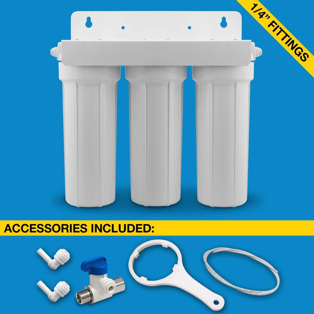 The H2O UCF-03-14-JG triple stage under-sink filter system can be easily installed under any faucet in your home or business.